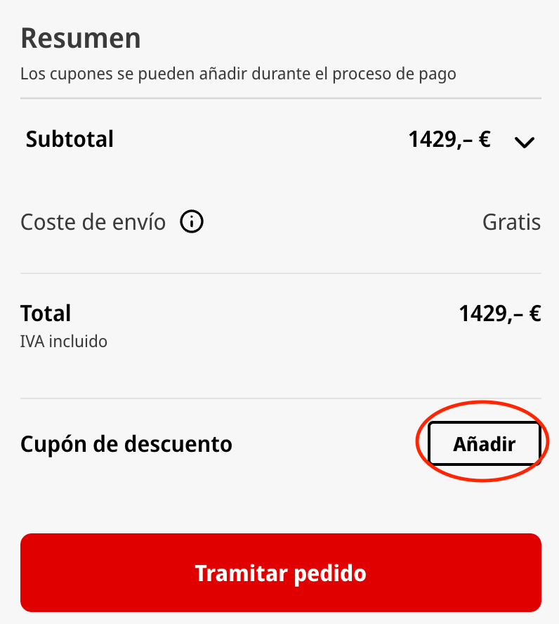 - Verás el resumen de pedido un apartado que dice "Cupón descuento" acompañado del botón "Añadir".